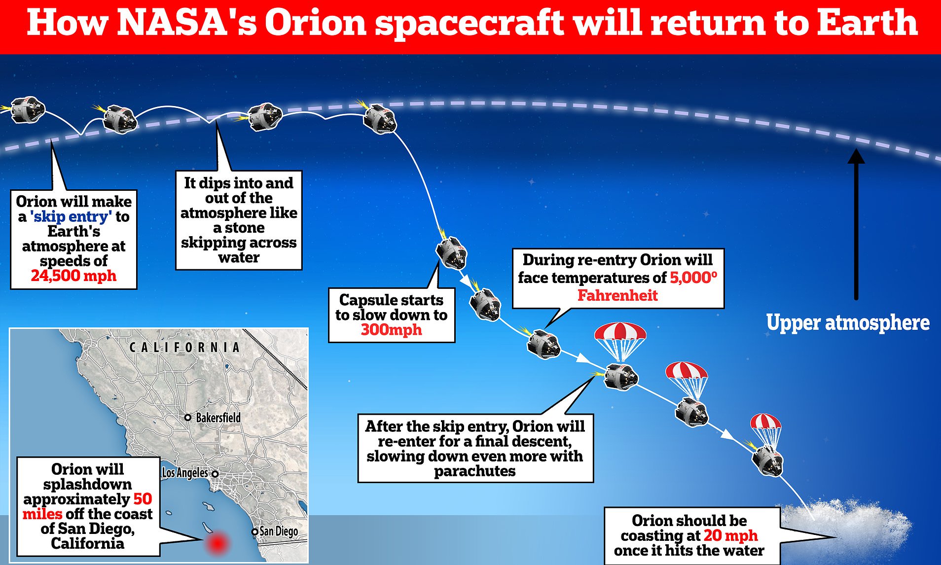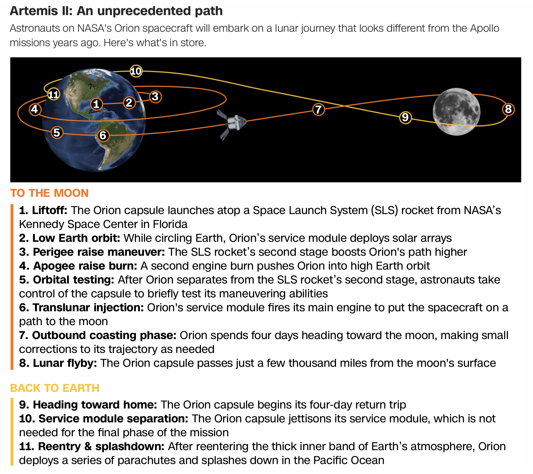 The first crewed mission to the vicinity of the Moon (no landing) Artemis II had slipped to April 2026, but now it has been pulled forward to February 2026 (next month!), when a crew of four will spend over ten days in space on Artemis II in a flight to the Moon approaching to within 4,600 miles, then in a free return manner (no need to have working engines) they will head back towards Earth.  All their energy will be removed by heat shields hitting the Earth’s atmosphere and then by the use of 11 parachutes, finally splashing down in the ocean. Note that on all 9 flights to the Moon of the Apollo program, the spacecraft came much closer to the Moon than this, and 8 of the flights went into orbit at around 60 to 70 miles above the surface. So this is a more conservative mission than those of Apollo.